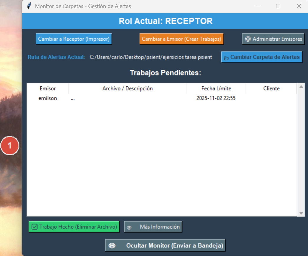 El rol de emisor dentro de la app le permite al usuario elegir una ruta de carpeta compartida y un archivo dentro de ella para crear la tarea o recordatorio con datos como plazo de tiempo, nombre del cliente, cantidad, información detallada etc. Al elegir el archivo dentro de la carpeta lo que hace la app es darle a la regla el mismo nombre del archivo y cuando el plazo termine el archivo se eliminara automáticamente junto al recordatorio. El rol de receptor es el que recibe todas esas reglas o recordatorios , el podrá ver información de todas las alertas dentro de una carpeta con antelación, marcarlas como hechas o aplazarlas.